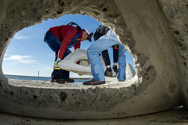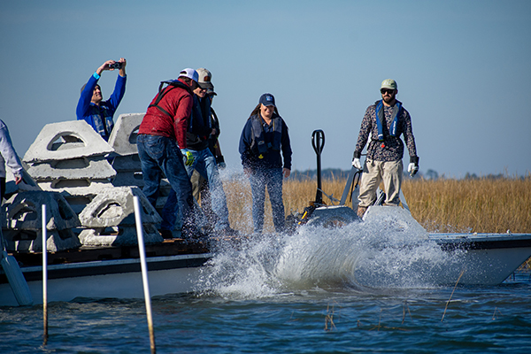 Volunteers from Coastal Conservation Association (CCA) Georgia assisted in the Dec. 12 deployment, helping to load the 100-pound concrete pyramids onto a 40-foot pontoon boat and placing them in the water at Romerly Marsh Creek. The concrete pyramids were molded and donated by Smyrna Ready Mix Concrete (SRM), a family-owned ready-mix, aggregates and cement company, at no cost to CRD or the State of Georgia using leftover concrete.